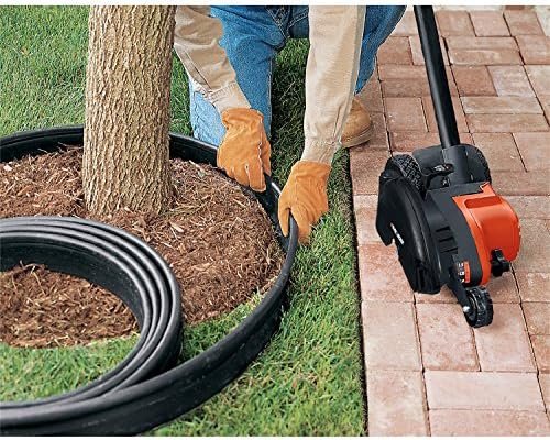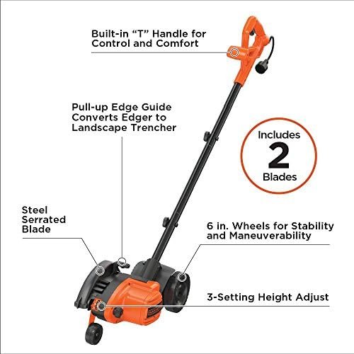 Power through tough overgrowth and dig clean-looking trenches around garden beds with this two-in-one BLACK+DECKER Electric Landscape Edger and Trencher. Powered by a corded high-torque 12 Amp motor, the Edger and Trencher features a 7-1⁄2 inch blade with three blade depths for maximum control. The pull-up edge guide lets you dig clean-trenches and cut clean lines with confidence, and an easy-access door on the guard makes cleaning simple. Trench around garden beds, trees, and other borders, install outdoor igniting or invisible dog fencing, and edge along hard surfaces like driveways, sidewalks, and patios all with one tool. The right and left-hand assist grip gives you additional handling capabilities. For high powered lawn care and clean edges and lines, look no further.
