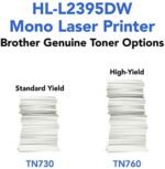 Replacing the dependable Brother HL L2380DW has been made easier thanks to the advanced technology and user friendly features built into the new HL L2395DW monochrome laser printer. This upgraded laser printer was developed with the busy home or small office owner in mind. Featuring a class leading print speed of up to 36 high quality prints per minute, the new Brother printer includes a conveniently equipped flatbed scan glass that permits quick scanning and copying directly from any device. Also, the wireless connectivity permits users to easily submit printing tasks directly from smartphones, laptops, desktop computers, and tablets. Built with a 2.7 color touchscreen, the Brother HL 2395DW monochrome laser printer helps you save time by allowing you to create customized shortcuts for your most commonly used features. A 250 sheet paper capacity tray allows you to print both letter and legal sized paper, designed to improve office efficiency. New technological features allow you to print from and scan directly to cloud based services, including Google Drive, Dropbox, Evernote, OneNote, and more. Costs can be reduced and quality ensured by using Brother Genuine high yield TN 760 replacement toner cartridge (also compatible with TN 730 replacement toner cartridge), available on Amazon. Brother is dedicated to superior customer service and stands by our products by offering a 1 year limited warranty on the Brother HL L2395DW monochrome laser printer. We also provide free online, call, or live chat support for the life of your printer. At Brother, we want to ensure that your experience with us is exceptional. If you have been looking for a user friendly monochrome laser printer with fast printing capacity and multiple user friendly features, add the Brother HL L2395DW to your Amazon shopping cart today. (1) Based on competing in class monochrome laser printers under 200 dollars. Print speed specifications gathered from manufacturer websites as of 1/9/2017.(2) Requires connection to a wireless network.(3) The mobile device must have NFC capability and run Android OS 4.4 or later.(4) Requires an Internet connection and an account with desired service.(5) TN 760 High Yield vs. TN 730 Standard Yield. Up to two times more prints and lower printing costs based on yields and MSRP. Standard Yield and High yield cartridges sold separately.(6) Approx. toner cartridge yield in accordance with ISO/IEC 19752 (letter/A4).(7) Reprinted from PCMag with permission. Copyright 2017 Ziff Davis, All Rights Reserved.(8) Drum yield is approx., and may vary by type of use.