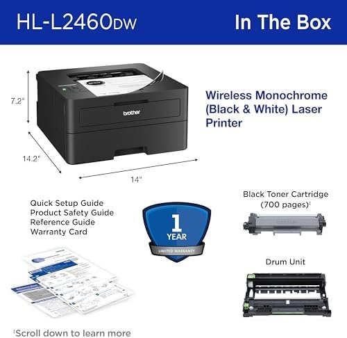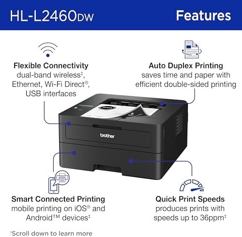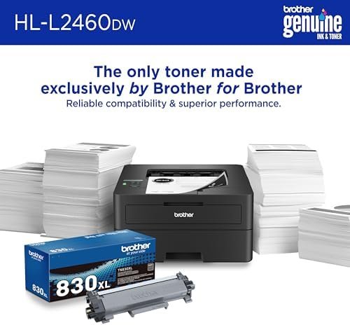 The Brother HL-L2460DW Wireless Compact Monochrome (Black & White) Laser Printer is the affordable choice for high-quality, high-volume printing. Engineered for exceptional efficiency, this reliable home office printer consistently produces crisp, easy-to-read black & white prints at speeds up to 36 pages per minute(2) (ppm). Its compact footprint means you can place this small printer in a convenient location on your desktop. Meanwhile, you can connect it to your devices through a range of flexible connection options, such as dual-band wireless, Ethernet, and USB 2.0. Best of all, you can print to your Brother printer from virtually anywhere with the Brother Mobile Connect App(3). Designed with productivity and sustainability in mind, featuring a convenient 250-sheet paper tray(4), which reduces the frequency of paper refills; automatic duplex printing, which saves time and reduces paper waste; and Toner Save Mode, which extends the life of your toner cartridge. Plus, this b/w laser printer is also ENERGY STAR® compliant and EPEAT® Silver rated. To help safeguard your information and maintain secure connections while printing, the HL-L2640DW includes a host of advanced security features. Use with Brother Genuine Supplies, expertly engineered by Brother to produce reliably sharp and smudge-free black & white prints in your Brother laser printer: Replacement Toner TN830 (Standard), TN830XL (High Yield), and TN830XL 2PK (Twin-Pack); and Replacement Drum Unit DR830. Disclaimers 1. Optional Refresh trial requires enrollment in a monthly billed Brother Refresh EZ Print Subscription service plan based on monthly printed page allotments. Unused pages roll over, limitations apply. Additional page set charges and taxes apply during trial. Plan, options offer, and pricing subject to change. Open to new subscribers located in the contiguous United States only. After the free trial period your credit card will be charged on a monthly basis for the Plan Fee, Overages, and Taxes in accordance with the Terms of Service. Overage fees will apply during free trial. Your service will continue on a month-to-month basis until you cancel it. May be canceled at any time. Upon cancellation, cartridge will be deactivated and must be replaced at users’ expense in order to continue printing. 2. Based on one-sided printing. Change from default setting required. 3. Free app download and wireless connection required. Compatibility may vary by device and operating system. 4. Maximum capacity based on using 20-lb. paper. 5. Based on monthly subscription cost in U.S. for Mono Laser Power Plan vs. average cost per page of eligible like standard capacity cartridges. Savings will vary based on Refresh EZ Print Subscription plan selected. ENERGY STAR and the ENERGY STAR mark are registered trademarks owned by the U.S. Environmental Protection Agency. Images are for illustrative purposes only. Specifications subject to change.