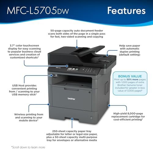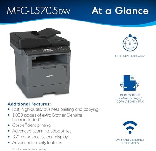 The Brother MFC-L5705DW monochrome laser all-in-one printer is a great choice for offices and small workgroups with higher print volumes that need cost-efficient printing, easy scanning, secure document handling and reliable, business quality output. This high-performance multifunction printer offers greater in-box value with 3,000 pages of toner included1. Help increase productivity with fast printing up to 42ppm2 and fast, two-sided scanning. Flexible paper handling includes the ability to expand to a 1,340-sheet total capacity with optional trays. Help minimize paper refills with a 250-sheet capacity paper tray that adjusts for letter or legal paper. Equipped with advanced security features to help limit document and device access and protect against network intrusions. 3.7” color touchscreen display allows for creation of up to 48 shortcuts to help streamline workflows. Offers flexible connectivity with standard Ethernet or wireless networking and convenient printing from mobile devices3.