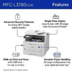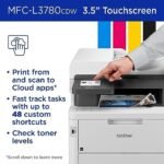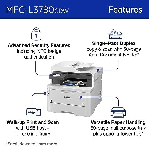The Brother MFC-L3780CDW wireless all-in-one, digital color printer with copy, scan, and fax functionalities is engineered to offer small business leaders an extraordinary level of efficiency with astounding print speeds and productivity-propelling features. Consistently produces pristine, laser-quality prints for smudge-free documents that capture the attention of clients, customers, and colleagues. Reaching print speeds up to 31 pages per minute (ppm)(2) and scan speeds up to 29/22 images per minute (ipm)(9) (black/color) plus versatile paper handling and an intuitive 3.5” touchscreen help your business thrive by boosting productivity and simplifying tasks. ENERGY STAR® compliant and EPEAT® Silver rated, the MFC-L3780CDW is designed with eco-friendly printer features including Eco Mode, Toner Save Mode, and automatic duplex printing. Advanced security features help safeguard sensitive information while printing, including the added protection of an NFC card reader for badge authentication. Engineered and supported by Brother with a 1-year limited warranty and free Brother online, call, or live chat support for the life of your printer, the MFC-L3780CDW is a hard-working and effective addition to any small workspace. 4. Disclaimers 1. Requires enrollment in a monthly billed Brother Refresh EZ Print Subscription service plan based on monthly printed page allotments. Unused pages roll over, limitations apply. Additional page set charges and taxes apply during trial. Plan, options offer, and pricing subject to change. Open to new subscribers located in the contiguous United States only. After the free trial period your credit card will be charged on a monthly basis for the Plan Fee, Overages, and Taxes in accordance with the Terms of Service. Overage fees will apply during free trial. Your service will continue on a month-to-month basis until you cancel it. May be canceled at any time. Upon cancellation, cartridge will be deactivated and must be replaced at users’ expense in order to continue printing. 2. Based on one-sided printing. Change from default setting required. 3. Maximum capacity based on using 20 lb. paper. 4. Maximum capacity based on using 20 lb. paper. Additional purchase required. 5. Requires an Internet connection and an account with desired service. 6. Requires connection to a wireless network. 7. Free app download and wireless connection required. Compatibility may vary based on device and operating system. 8. Based on monthly subscription cost in U.S. for Color Laser High Plan vs. average cost per page of eligible like standard capacity cartridges. Savings will vary based on Refresh EZ Print Subscription plan selected. 9. Color and monochrome scan speed with all advanced features turned off, Letter at 300dpi. Wi-Fi Direct is a registered trademark of Wi-Fi Alliance®. EPEAT is a trademark of the Green Electronics Council in the United States and other countries. ENERGY STAR and the ENERGY STAR mark are registered trademarks owned by the U.S. Environmental Protection Agency. Images are for illustrative purposes only. Specifications subject to change.