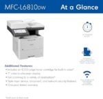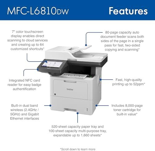 The Brother MFC-L6810DW enterprise monochrome laser all- in-one printer is a great choice for mid to large-sized workgroups that need fast, high-quality output, low-cost printing, large paper capacity, and advanced security features. This high-performance all-in-one printer helps to increase productivity with fast print and copy speeds up to 52ppm(1). Offers built-in value with an included Brother Genuine 8,000-page toner cartridge. Delivers a low total cost of ownership by using the Brother Genuine TN920UXXL ultra high-yield replacement toner cartridge for 18,000-pages(2). Triple Layer Security features help to safeguard your network, keep your devices secure, and protect documents in transit to and from print devices. Includes an integrated NFC card reader for easy badge authentication. The 80-page capacity auto document feeder(3) offers single-pass, two-sided, scanning up to 100ipm(4). Features a large document glass for up to legal-sized documents. Scan to popular destinations directly from the touchscreen display including cloud services(5), email, SharePoint, SSH Server (SFTP), and more. Create searchable and editable Microsoft Office documents including Word, Excel, and PowerPoint(6). Spend less time refilling paper trays with the 520-sheet capacity paper tray, 100-sheet capacity multipurpose tray for printing on custom media or envelopes, and 250-sheet output capacity(3). Total capacity is expandable up to 1,660 sheets with optional trays(7). Features built-in Gigabit Ethernet and dual band wireless networking to seamlessly set up and share on your wired or wireless network. Easily print from and scan to wide variety of mobile devices(8). Equipped with device management solutions to enable mass distribution of device configurations, security settings, firmware updates, and task automation. 7” color touchscreen display allows for seamless menu navigation and the creation of up to 64 customized shortcuts for your most frequently used tasks. ENERGY STAR® certified and EPEAT® Silver rated. Help save paper with default duplex printing. Eco Mode helps to reduce power consumption, while Toner Save Mode helps to reduce toner use. One-year limited warranty with free online, live chat, or phone support for the life of your product. 1 Based on one-sided printing. Change from default setting required. 2Approximate toner cartridge yield in accordance with ISO/IEC 19752 (letter/A4). 3 Maximum capacity based on using 20 lb. paper. 4Monochrome scan speeds in accordance with ISO/IEC 17991 with all advanced features turned off, using letter-sized paper at 200/300dpi. . 5 Requires an Internet connection and an account with desired service. 6 Requires an Internet connection. 7 Requires additional purchase. 8 Additional download required. Compatibility may vary by device or operating system. Wireless connection may be required.