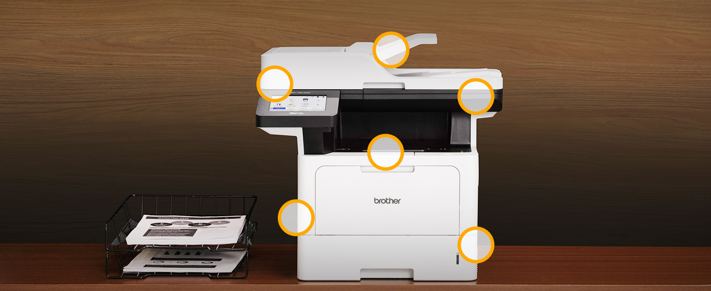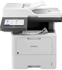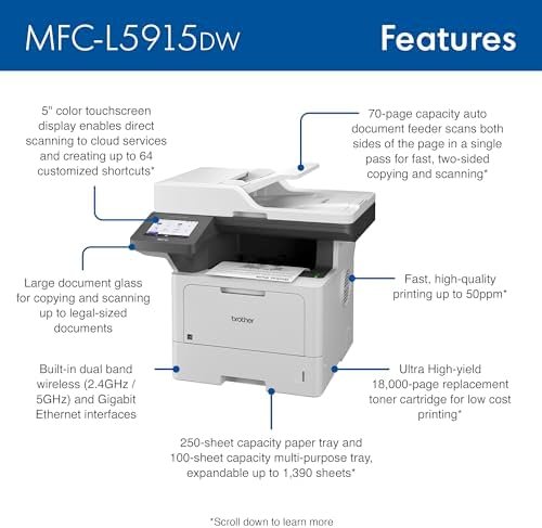 The Brother MFC-L5915DW business monochrome laser all-in-one printer is a great choice for busy offices and workgroups with higher print volumes that need fast, high-quality output, lowcost printing, versatile paper handling, and advanced security features. This high-performance all-in-one printer helps to increase productivity with fast print and copy speeds up to 50ppm1 . Delivers low-cost printing by using the Brother Genuine TN920UXXL ultra high-yield replacement toner cartridge. Triple Layer Security features help to limit document and device access and protect against network intrusions. Offers expandable paper capacity that is scalable as your business needs grow. Quickly scan multi-page documents to a wide variety of destinations using the 70-page capacity2 auto document feeder. The 5” touchscreen display allows for the creation of customized shortcuts to your most frequently used workflows. The MFC-L5915DW also provides flexible connectivity with built-in Gigabit Ethernet and dual band wireless networking, plus convenient mobile device printing to meet mobile workforce demands3 .
