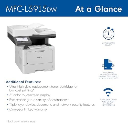 Brother Professional Laser Printer All-in-One with Scanner and Copier, High-Speed 50 ppm Monochrome Printing, Wireless Network Ready, Dual-Band WiFi, Auto 2-Sided Print (MFC-L5915DW)