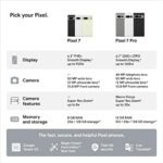 Meet Google Pixel 7. Powered by Google Tensor G2, it’s fast and secure, with amazing battery life and the advanced Pixel Camera for beautifully authentic, accurate photos with Real Tone and stunning video with Cinematic Blur. Plus, it’s Pixel’s most refined design, made with recycled materials.[11] LEGAL [1]Compared to Pixel 6. Speed and power efficiency claims based on internal testing on pre-production devices. [2]Works with all major carriers. 5G service is carrier dependent. Requires a 5G data plan (sold separately). 5G service not available on all carrier networks or in all areas. Contact carrier for details. 5G service, speed, and performance depend on many factors, including carrier network capabilities and signal strength. Actual results may vary. Some features not available in all areas. Data rates may apply. See g.co/pixel/networkinfo for info. [3]For “over 24 hours”: Estimated battery life based on testing using a median Pixel user battery usage profile across a mix of talk, data, standby, and use of other features. Average battery life during testing was approximately 31 hours. Battery testing conducted on a major carrier network. For “Up to 72 hours”: Estimated battery life based on testing using a median Pixel user battery usage profile across a mix of talk, data, standby, and use of limited other features that are default in Extreme Battery Saver mode (which disables various features including 5G connectivity). Battery testing conducted on a major carrier network. For both claims: Battery testing conducted in California in mid 2022 on pre-production hardware and software using default settings, except that, for the “up to 72 hours” claim only, Extreme Battery Saver mode was enabled. Battery life depends upon many factors and usage of certain features will decrease battery life. Actual battery life may be lower. [4]Measured diagonally; dimension may vary by configuration and manufacturing process. Smooth Display is not available for all apps or content. [5]Not available for all camera apps or modes. [6]Coming soon. Restrictions apply. Some data is not transmitted through VPN. Not available in all countries. All other Google One membership benefits sold separately. Use of VPN may increase data costs depending on your plan. See g.co/pixel/vpn for details. [7]Earbuds and watch sold separately. Requires Pixel Buds Pro connected with Fast Pair to a device with location history enabled. Requires Google Pixel Watch to be connected to a compatible device. [8]Designed to comply with dust and water protection rating IP68 (for Pixel 7 and Pixel 7 Pro) and IP67 (for Pixel 6a) under IEC standard 60529 when each device leaves the factory but the device is not water or dust proof. The accessories are not water or dust resistant. Water resistance and dust resistance are not permanent conditions and will diminish or be lost over time due to normal wear and tear, device repair, disassembly or damage. Dropping your device may result in loss of water/dust resistance. Liquid damage voids the warranty. See g.co/pixel/water for details. [9]Requires Google Photos app. Magic Eraser may not work on all image elements. [10]Some third party apps and data may not be transferred automatically. Visit g.co/pixel/copydatahelp for information. [11]Recycled materials are approximately 19% of phone based on weight. [12]Not available in all languages or countries. Not available on all media or apps. See g.co/pixel/livetranslate for more information. Translation may not be instantaneous. [13]Maximum resolution and field of view with RAW image files setting turned on. Setting is turned off by default. See g.co/pixel/photoediting for more information. [14]Storage specifications refer to capacity before formatting. Actual formatted capacity will be less. [15]Unblurring may not work on all photos or videos with faces. [16]Requires compatible smart device. [17]The Google One and YouTube Premium 3-month trial offers are available to eligible users with the purchase of Pixel 7 Pro. Offer expires December 15, 2023 at 11:59 pm PT. Valid form of payment required at sign-up, but you will not be charged until the trial period expires. Cancel anytime. See youtube.com/premium/restrictions and one.google.com/offer/terms-and-conditions/pixel7and7pro for full terms. [18]See g.co/pixel/astrophotography for details. [19]Watch and earbuds sold separately. [20]Pixel Stand sold separately. Wireless charging rates up to 20W (Pixel 7) and up to 23W (Pixel 7 Pro) charging with Google Pixel Stand (2nd gen) (sold separately). Up to 12W with Qi-certified EPP chargers (sold separately). Actual results may be slower. [21]Measured diagonally; dimension may vary by configuration and manufacturing process. [22]Wireless charging rates up to 20W (Pixel 7) and up to 23W (Pixel 7 Pro) charging with Google Pixel Stand (2nd gen) (sold separately). Up to 12W with Qi-certified EPP chargers (sold separately). Actual results may be slower. Fast wired charging rates (up to 18W on Pixel 6a, up to 20W on Pixel 7 and up to 23W on Pixel 7 Pro) are based upon use of the Google 30W USB-C® Charger or Google 18W USB-C® (Pixel 6a only) plugged into a wall outlet. Actual results may be slower. Chargers and Pixel Stand sold separately. [23]Estimated battery life based on testing using a median Pixel user battery usage profile across a mix of talk, data, standby, and use of other features. Average battery life during testing was approximately 29 hours. Battery life depends upon many factors and usage of certain features will decrease battery life. Battery testing conducted in California in early 2022 on pre-production hardware and software, using default settings. Battery testing conducted using Sub-6 GHz non-standalone 5G (ENDC) connectivity. Actual battery life may be lower.