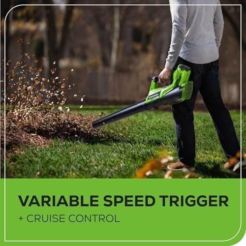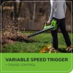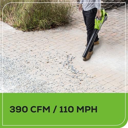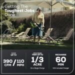 [Driveway Hurricane Force] – 110MPH/390CFM blower banishes wet maple leaves and debris from concrete surfaces – cruise control maintains perfect gutter-clearing power.