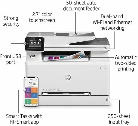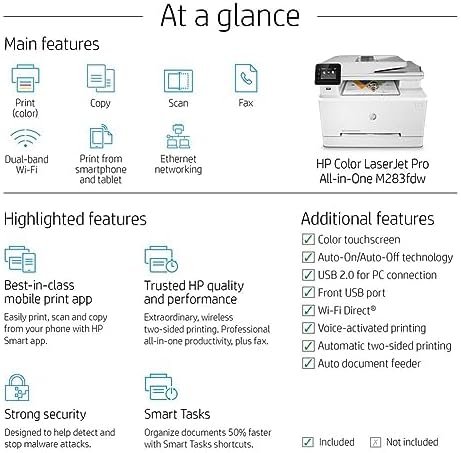 Get extraordinary, wireless performance and fast multifunction versatility with the HP Color LaserJet Pro M283fdw Wireless All-in-One Laser Printer. This color laser printer lets you easily print and scan from your mobile device with HP Smart, HP’s best-in-class mobile print app; plus, automate repetitive tasks and organize documents 50% faster with exclusive office features in the HP Smart app. Breeze through tasks with print, scan, copy, and fax capabilities, print speeds up to 22 ppm, and an easy-to-use 2.7″ color touchscreen. Stay productive with this wireless printer’s 250-sheet input capacity and 50-page automatic document feeder. And, keep your office connected and protected with this HP LaserJet printer’s dual-band Wi-Fi and strong security designed to detect and stop attacks.
