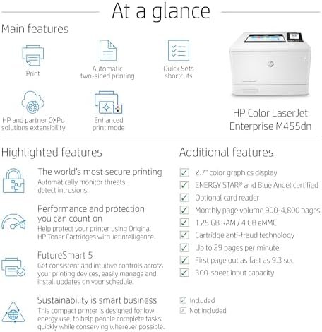 Get strong security, enhanced productivity and sustainability with the HP Color LaserJet Enterprise M455dn Printer. This color laser printer’s dynamic security continually monitors memory activity to detect and stop attacks in real time, and automatically checks firmware during startup. With print speeds up to 29 ppm and first page out as fast as 9.3 seconds (black) and 10.9 seconds (color), this entry-level enterprise printer empowers your team to complete tasks quickly. Save paper with automatic two-sided printing and help reduce wasted supplies with HP Roam for Business. Protect your color printer and produce high-quality color graphics while avoiding reprints with Original HP toner cartridges with JetIntelligence.