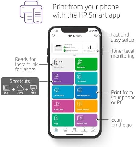 This printer is built for maximum productivity with fast speeds and reliable hardware, delivering effortless everyday use from wherever work happens so you can focus more on your business.Workteams excel with HP’s black-and-white office LaserJet printers, which pack extra punch with high-quality results, extra power, and more features. Maximum productivity. Support your dynamic workteam with this high-speed smart printer, ideal for up to 10 users.Step up your workflow with blazing fast speeds to meet high-demand environments.Get productivity in the palm of your hand. Print, scan and get time-saving Shortcuts with HP Smart app. Don’t wait for print jobs. With no warm up time your printer is always ready. Seamless management. Centralize print management for your enterprise. HP Web Jetadmin makes it easy with its suite of features. Set up your printers quickly wherever work happens. Cloud connectivity makes it easy for your IT team.Access your printers from a single dashboard. Smart Admin guides you through setup and gives IT visibility. HP Wolf Pro Security. Get printer security out of the box. Preconfigured settings mean it’s ready when you are. Set up your printer security from the dashboard. Smart Admin makes IT configuration and monitoring easy. Add a layer of security. PIN/pull option authenticates your print jobs only when you’re present.Set configuration policies and validate settings universally with HP Security Manager. Hassle-free supplies management with Instant Ink for lasers. Enroll to save on Original HP Toner with Instant Ink for lasers. Get toner, delivery and recycling. Never run out of toner with Instant Ink for laser. Cartridges are delivered automatically and only when you need it.Manage your subscription to get cartridges delivered to multiple locations on a single consolidated bill.With Instant Ink, you get to select the right plans for each of your printers. Change or cancel at any time.