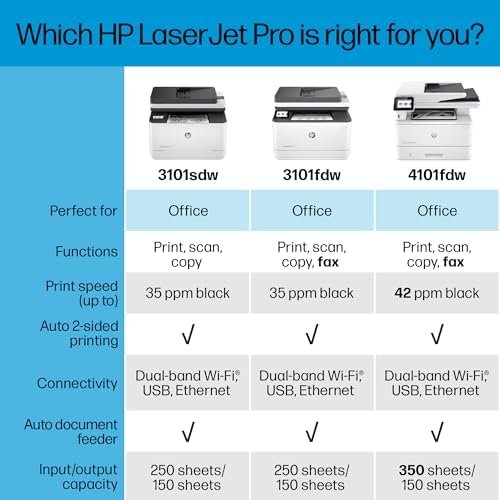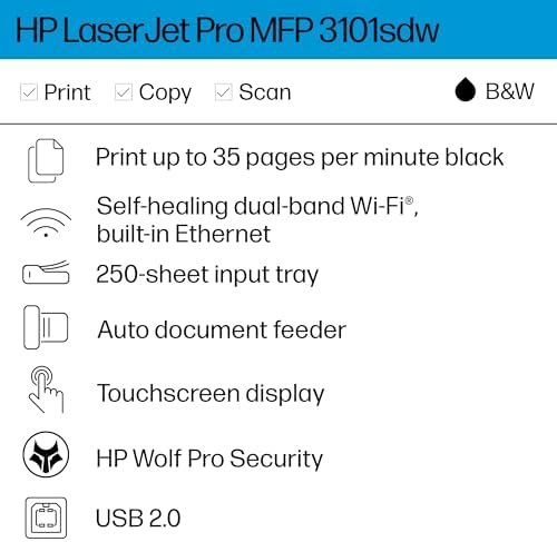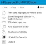 Get high-speed printing and scanning, and connectivity for seamless workflow and management with the LaserJet Pro MFP 3101fdw. Get fast speeds and powerful productivity with the multifunction LaserJet Pro 3101fdw. Get laser quality black & white printing for all your business documents. Set up and manage printers in multiple locations with a single dashboard.