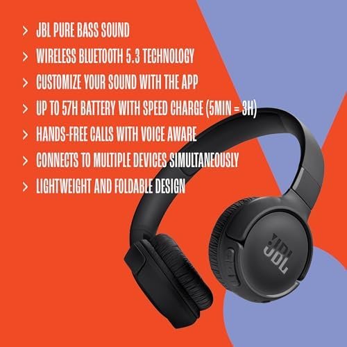 JBL Tune 520BT – Wireless On-Ear Headphones, Up to 57H Battery Life and Speed Charge, Lightweight, Comfortable and Foldable Design, Hands-Free Calls with Voice Aware (Black)
