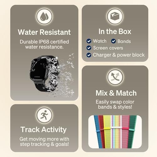 ALL THE ESSENTIALS –– JrTrack 5 is equipped with the simple every-day essentials for kids on the go: Alarms & reminders, step counter, activity goals, calculator, timer, stopwatch, find my watch feature, and more!