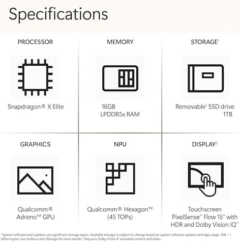 BRILLIANT DISPLAY AND GRAPHICS – 15″ 2K+ (2496 x 1664) PixelSense Flow, HDR, 120Hz, 600 nits, 3:2 Aspect ratio, Touchscreen. Integrated Qualcomm Adreno Graphics, Support to expanded monitor via USB-C Port. Maximum supported resolution of 4k (3840×2160) @60Hz; 1080p Webcam with Windows Hello.