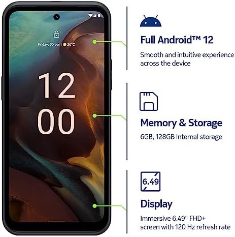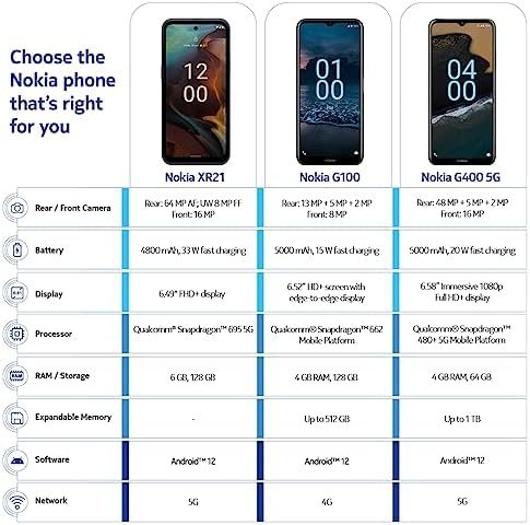 The Nokia XR21 5G unlocked smartphone runs Android 12 with a 6.49-inch screen, 6GB RAM/128GB storage, 64MP dual rear cameras, and a long-lasting battery.