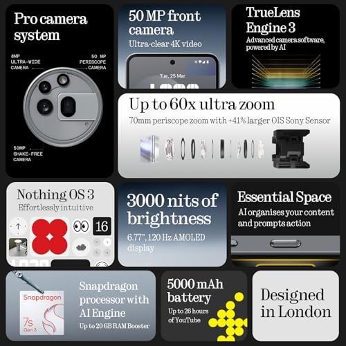 Nothing Phone (3a) Pro Smartphone, 6.77″ 120Hz AMOLED Display, 50MP Front Camera, Snapdragon 7s gen3 Processor, Bluetooth 5.4, IP64 Waterproof, 5000mAh,Dual Nano-SIM, Android 15, 12+256GB Black