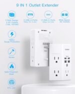 Just plug into a power outlet, this USB outlet can expands 1 outlet to 5 AC outlets & 4 smart USB charging ports which allow you to power up to 9 devices simultaneously.